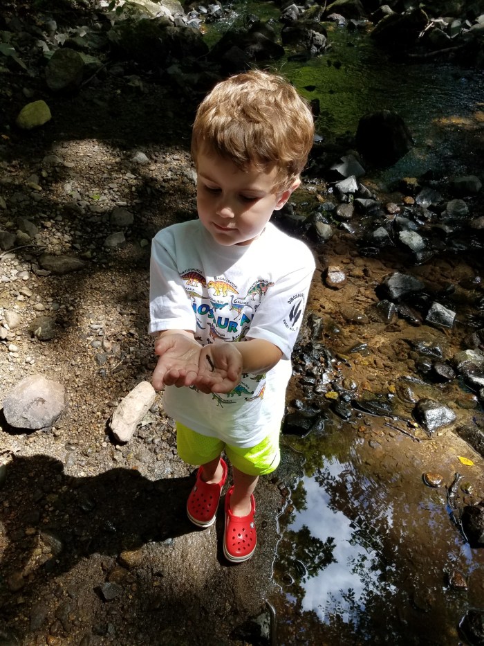 Andrew’s mom and step-dad joined us on this hike. We took the Red Blaze Trail along boardwalks and interpretive signs toward the North Branch of Pootatuck River. At the river we stopped to search for salamanders and fish and to talk to an abutting neighbor who was happy to see us playing in the woods. We took the main middle trail back to the lot but there are plenty of other trails to explore throughout the property too. The trails we stuck to were all in the wooded section, but there are also some fields to explore.