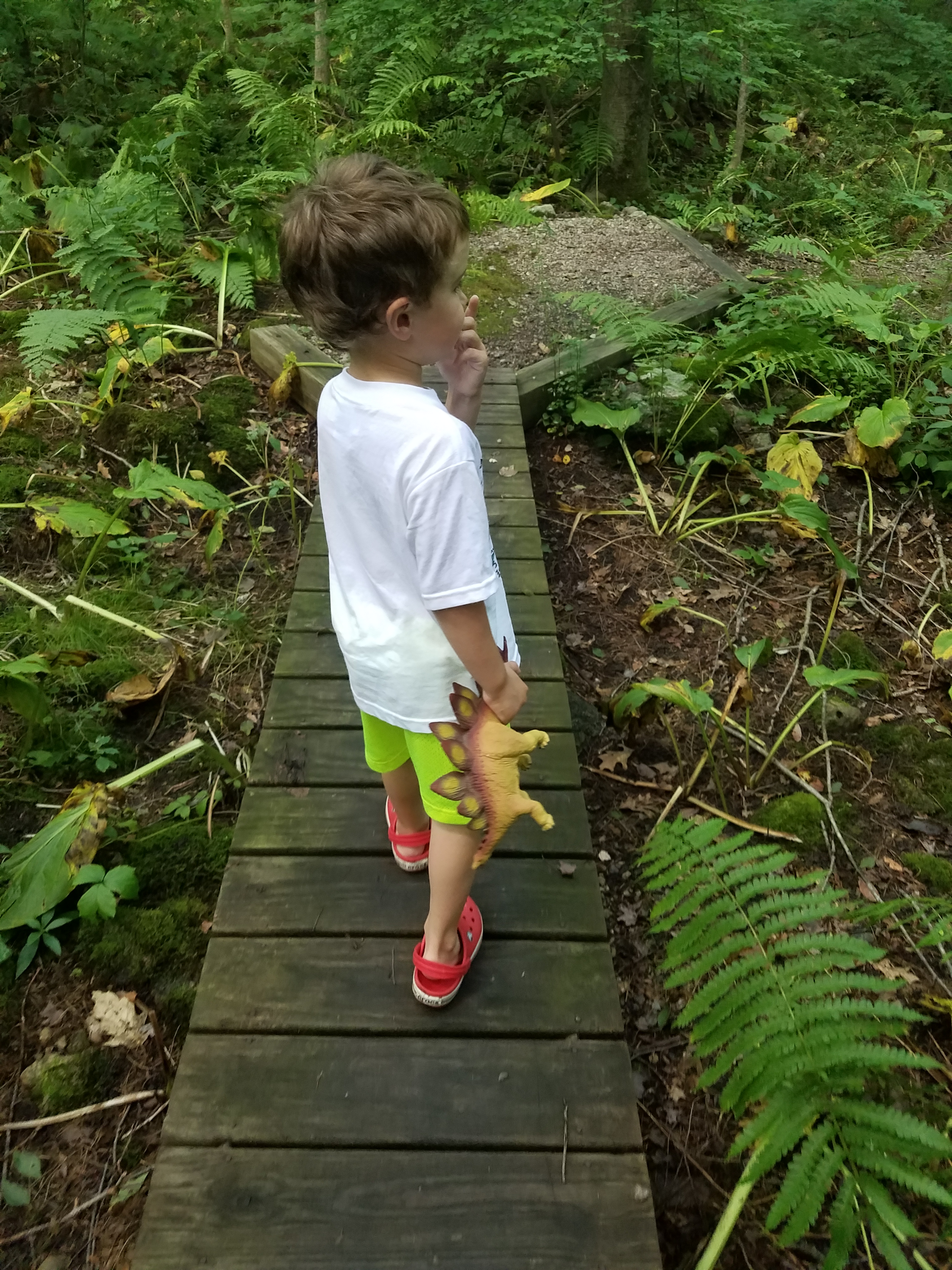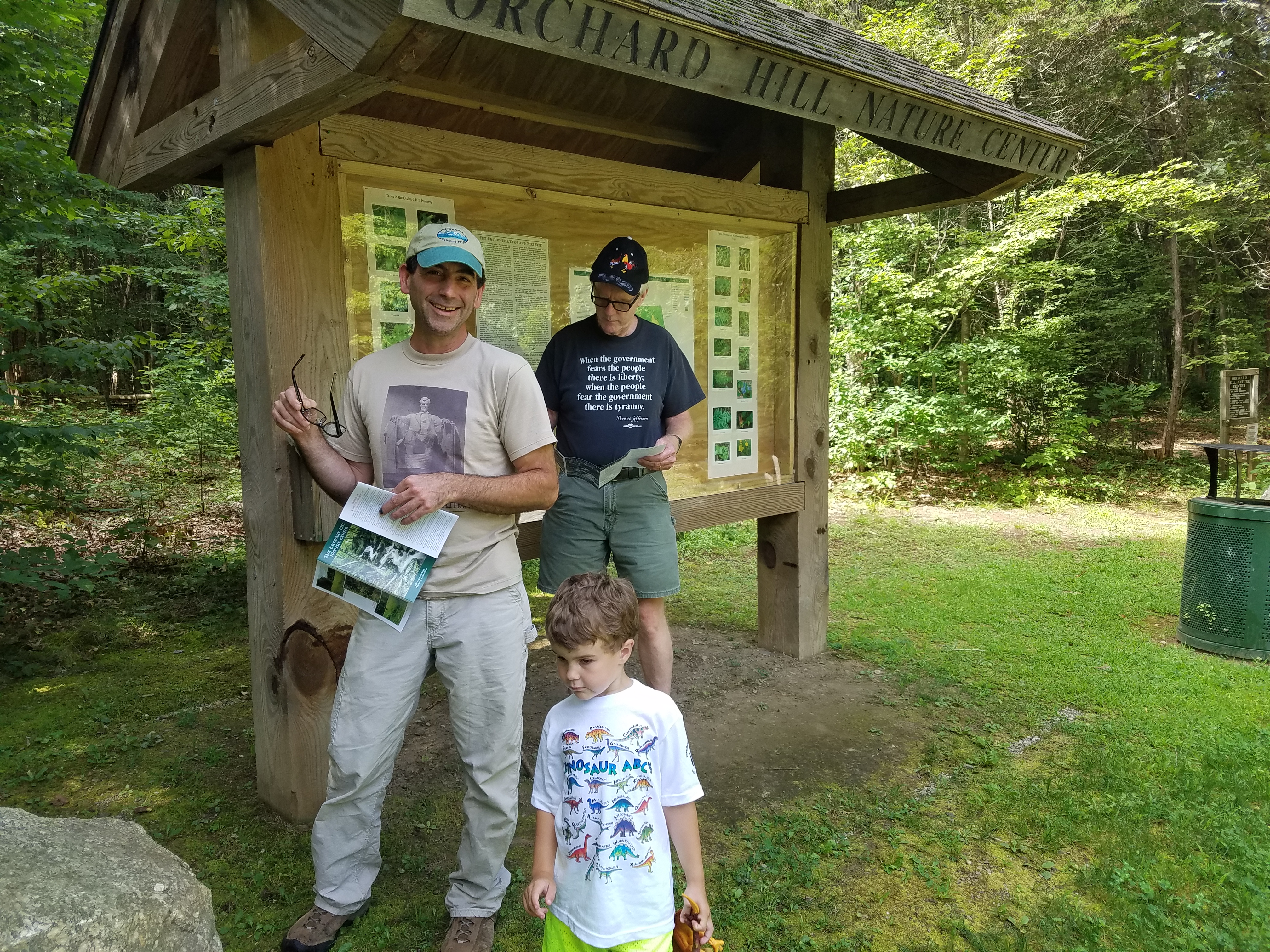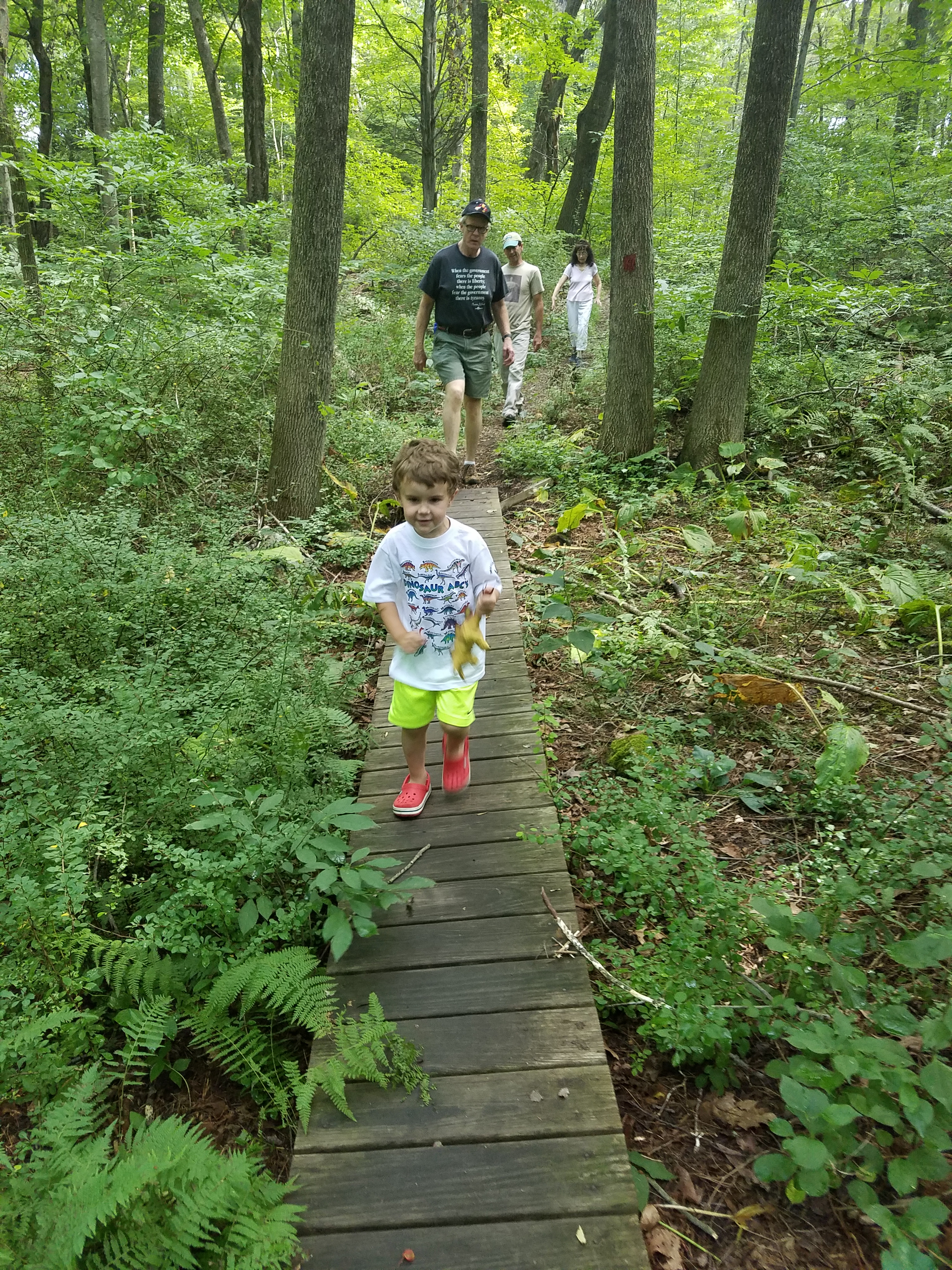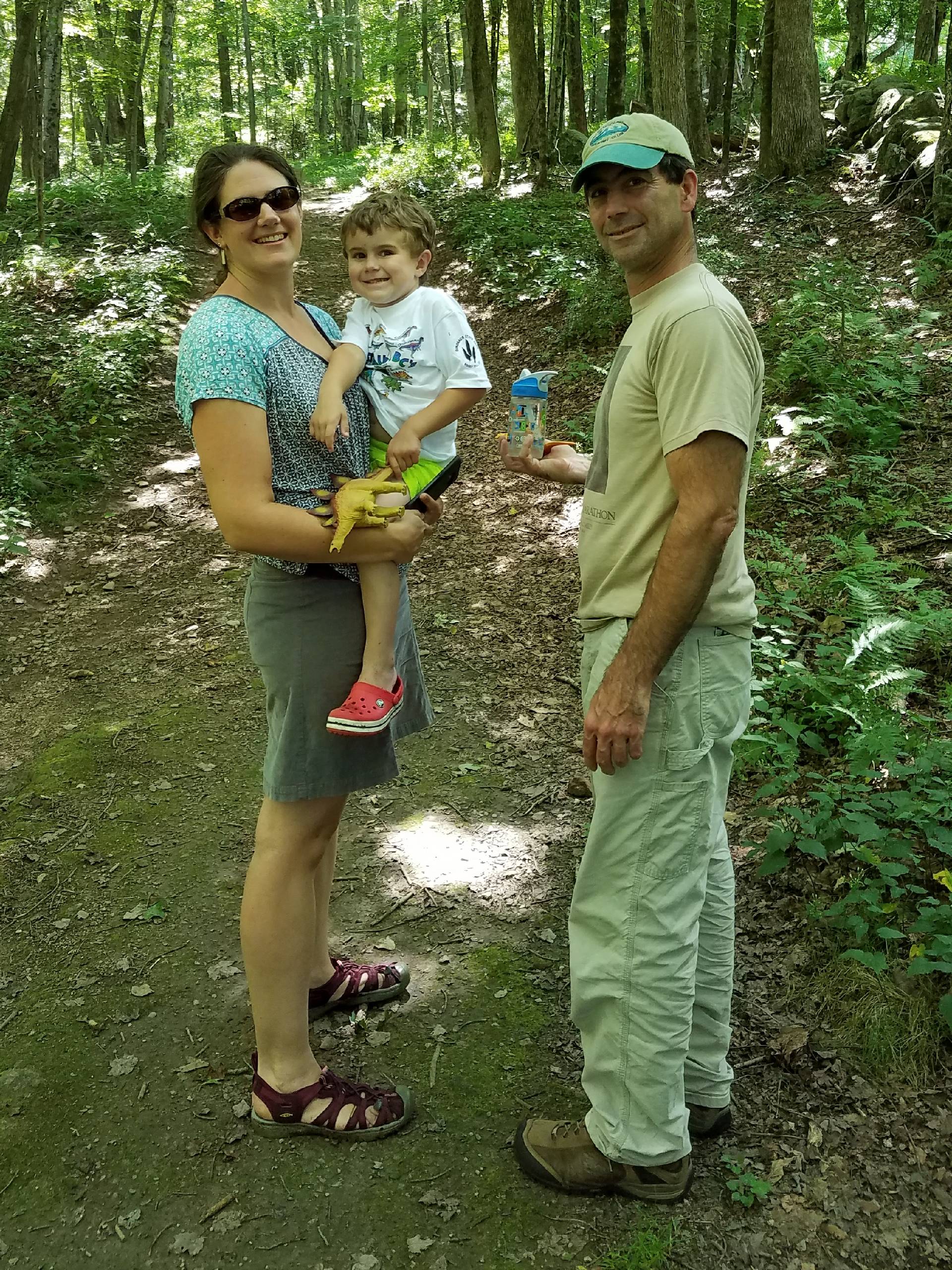 Andrew’s mom and step-dad joined us on this hike. We took the Red Blaze Trail along boardwalks and interpretive signs toward the North Branch of Pootatuck River. At the river we stopped to search for salamanders and fish and to talk to an abutting neighbor who was happy to see us playing in the woods. We took the main middle trail back to the lot but there are plenty of other trails to explore throughout the property too. The trails we stuck to were all in the wooded section, but there are also some fields to explore.