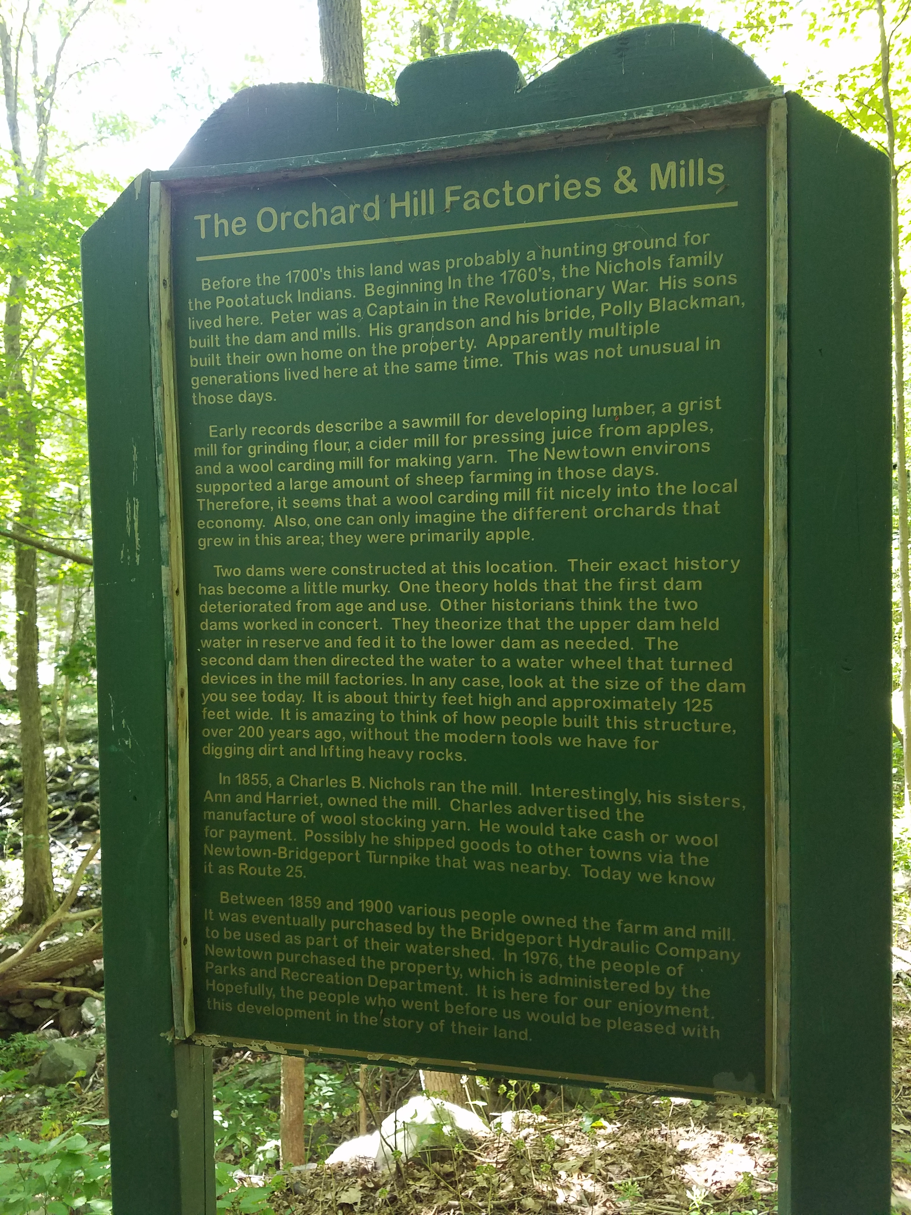 Even before Andrew started tromping around on this property, there is an interesting history. It was a farm settled in the 1700’s and you can still see the stonewalls criss-crossing through the woods, indicating that this was once open pasture. At the North Branch of Pootatuck River crossing you will see remnants of a stone dam. This was once a sawmill, site of a grist mill, cider mill, and a wool-carding mill. It’s amazing that today nature has taken back this once vibrant area. In 1976, Newtown purchased the property, but it sat without organized use for several decades. Andrew and his friends made trails and explored throughout the property in the 1980’s, when they built crude log bridges and blue-blazed a few trails that became part of today’s network. Recently the Newtown Lions adopted the area, McCord Engineering revised the map, and the Town & Country Garden Club identified plants for an interpretive trail. It’s now a full-fledged hiking area, with plenty of parking and easy access.