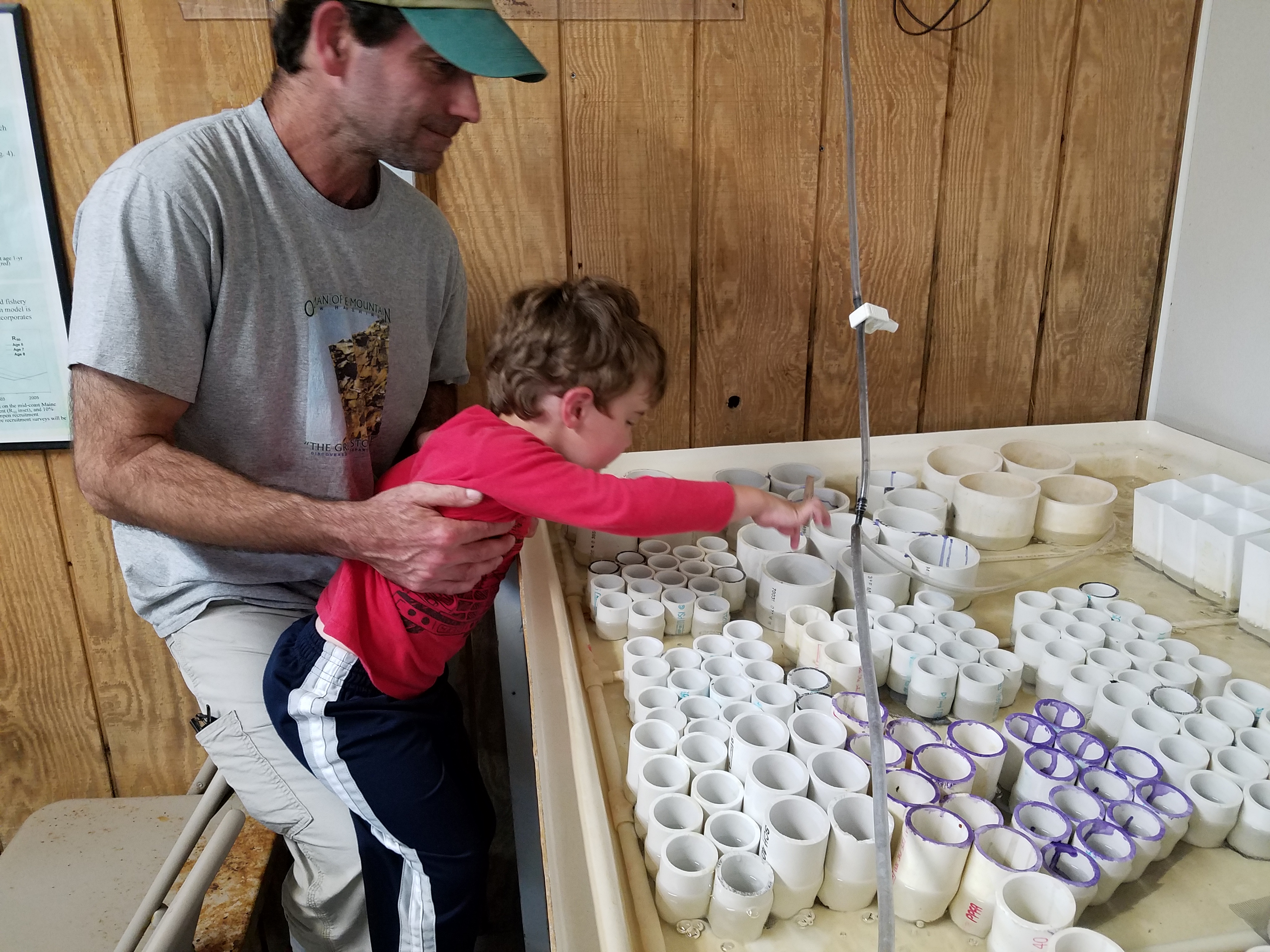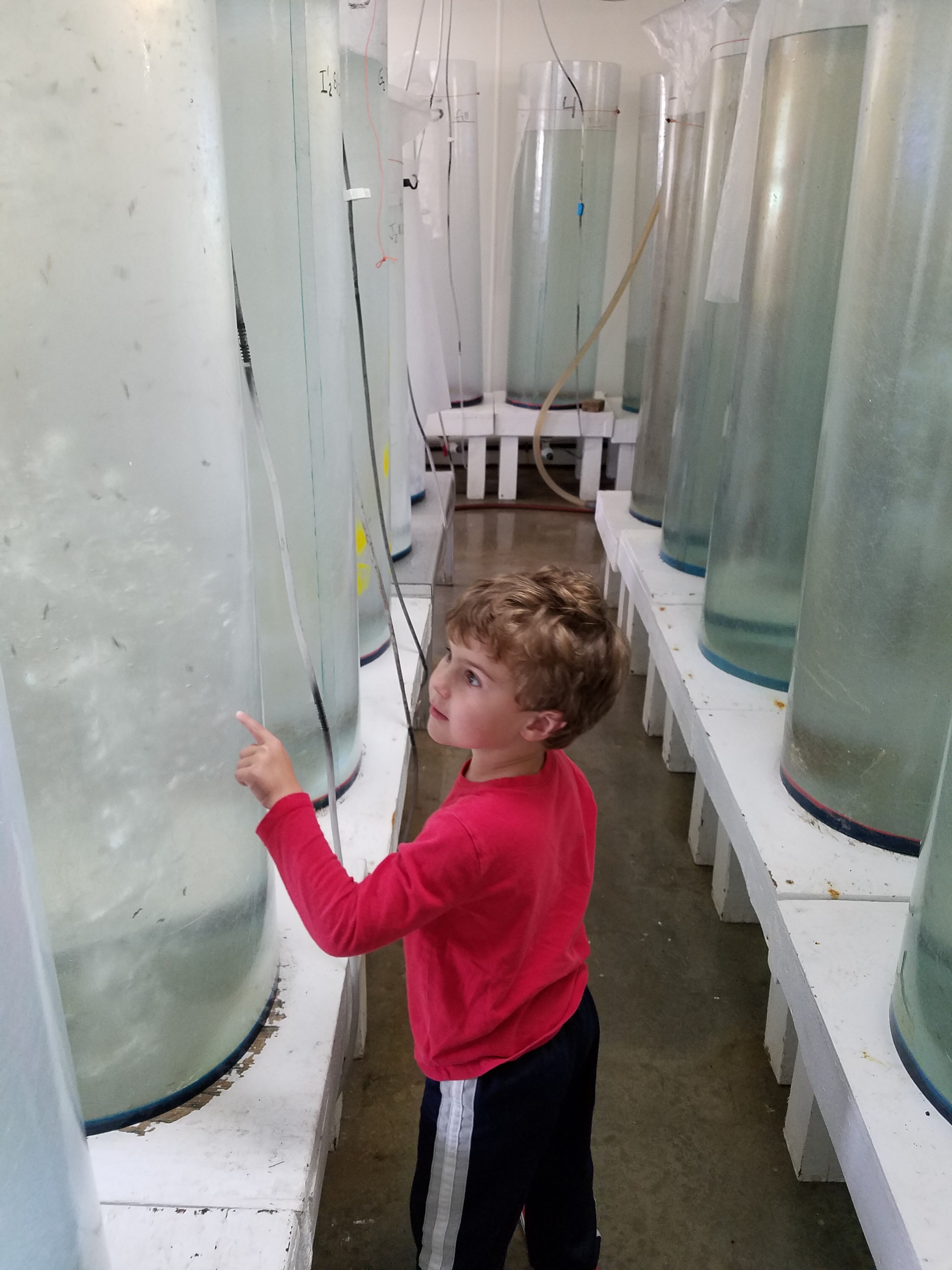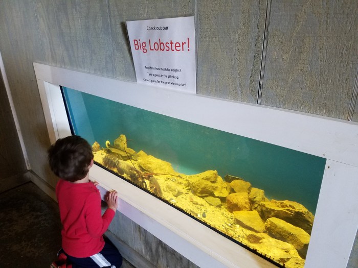 Next up we headed to the Lobster Hatchery. A one-of-a-kind hatchery (run on a shoestring budget) that raises lobsters and releases them back into the ocean. An older gentleman gave a talk all about The life cycle of lobsters and how they raise lobsters. Did you know that female lobsters individually glue 10,000 eggs on their abdomen! The talk was a little long for a 4 year old and we slipped out of the room for the last 10 minutes, but went back in when we were allowed to explore and see the lobsters in the tanks. They do offer a coloring station for kids, but Alden wasn’t interested.