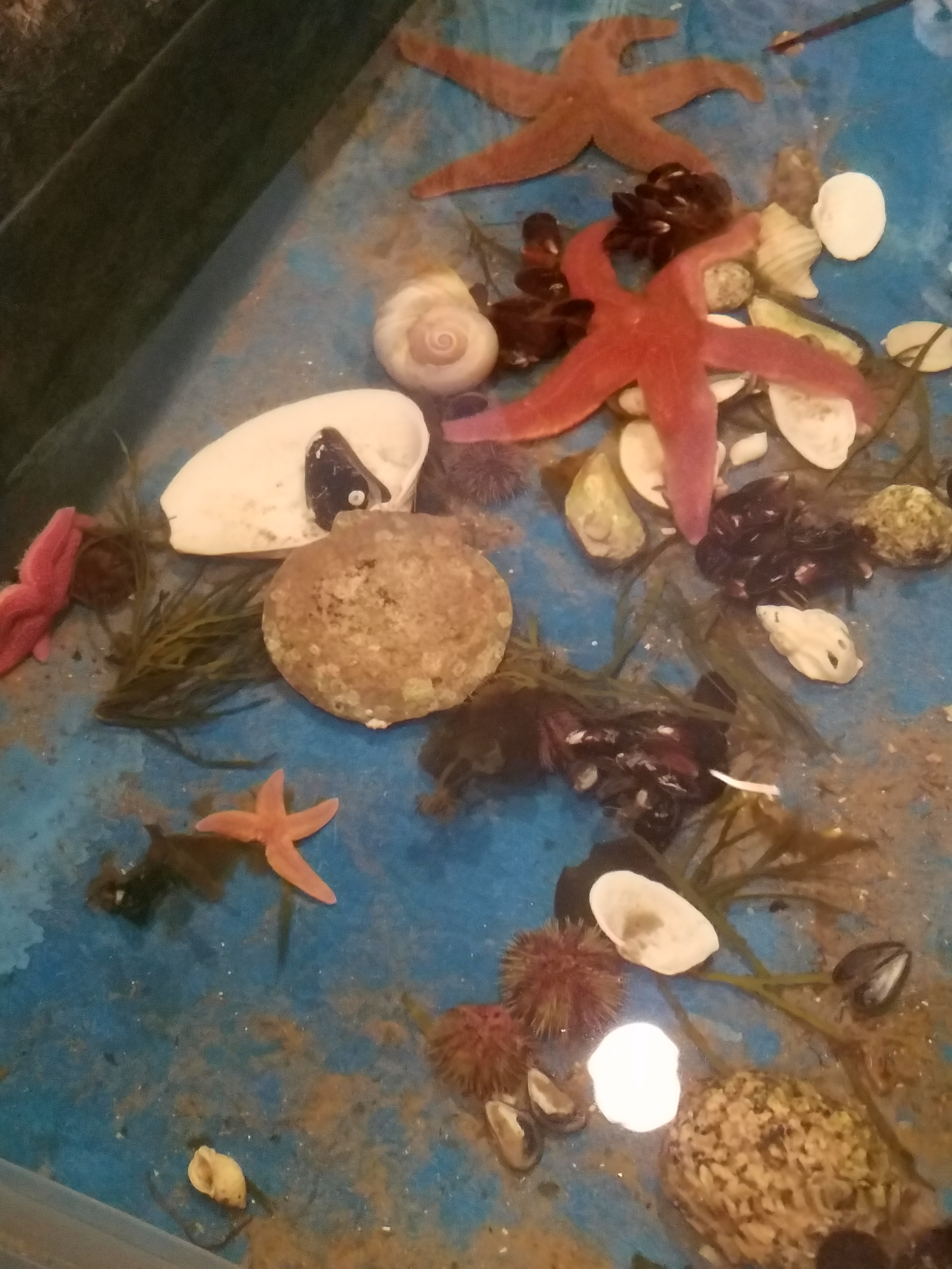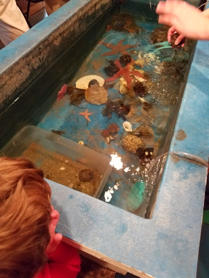 We were to go to the Touch Tank area first. This was great and we learned a lot from a young man who was very knowledgeable and great with the visitors. We saw and touched horseshoe crabs, sea stars, sand dollars, urchins, and sea snails. Did you know that horseshoe crabs (relics from the time of the dinosaurs) have 10 eyes! And sea stars have no brains, no blood, and their arms are hollow!