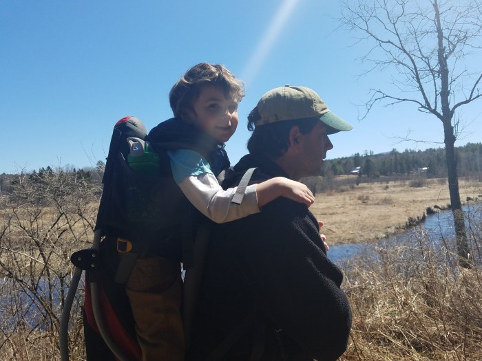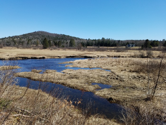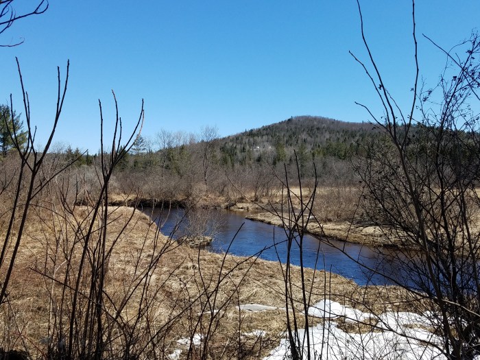 Last week on Earth Day we took an adventure to Dalton, NH with the SPNHF property: David Dana Forest as our destination. The property is easily located minutes from downtown Whitefield. We combined this into two small hikes, the first along a snowmachine trail corridor that borders the David Dana Forest on one side, and the Johns River on the other side. The second hike was along the Main Trail in the David Dana Forest to the Gold Mine.