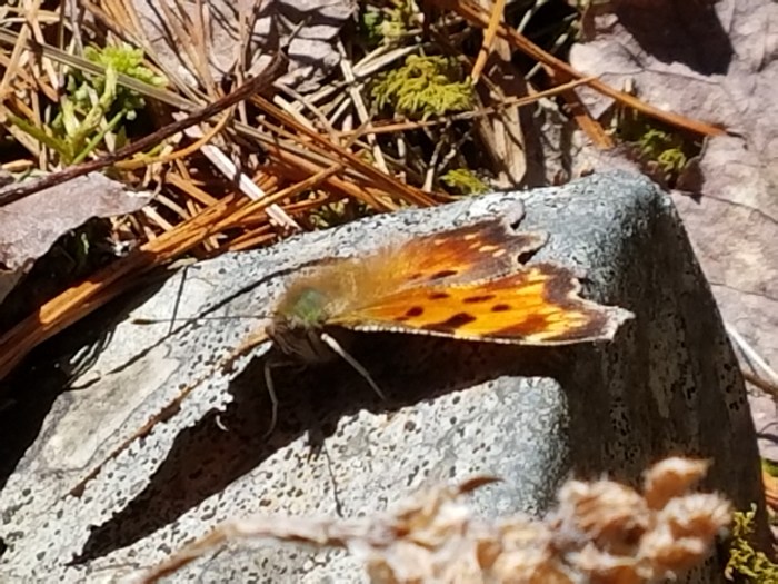 When we got back to the car, we decided to head over to the Main Trailhead within the David Dana Forest off of Ridge Road. The hiking trail started in a lovely dense evergreen forest with moss below our feet. Just minutes after Lindsay mentioned the butterflies we should keep an eye out for, an eastern comma fluttered into our path. We hiked along quickly passing a trail to the west and then turned northwest at the Lower Ox Team Road trail. The next intersection was for the Gold Mine Trail.