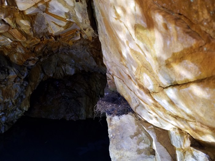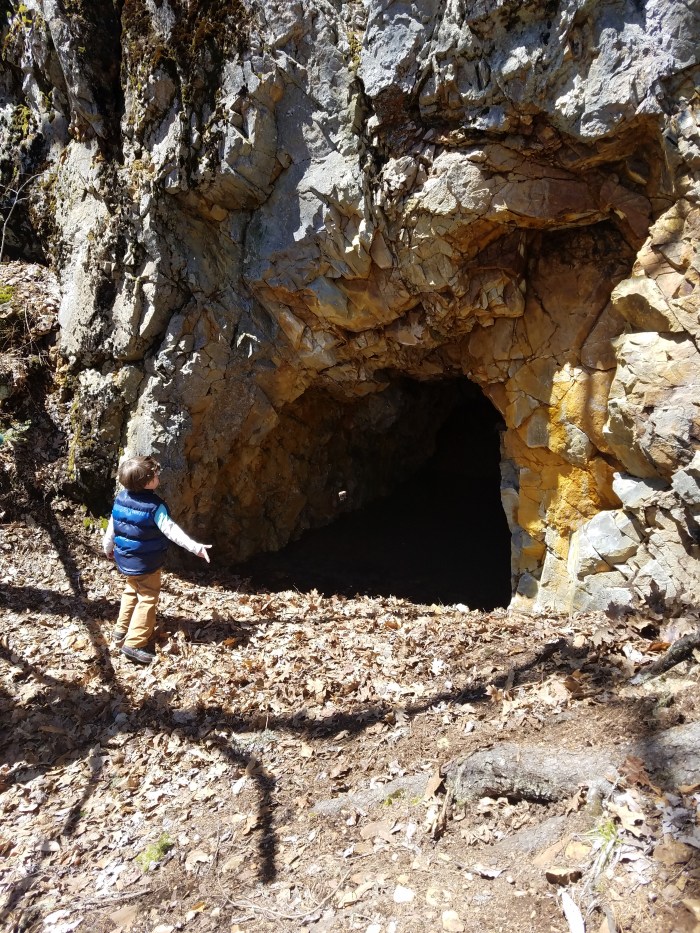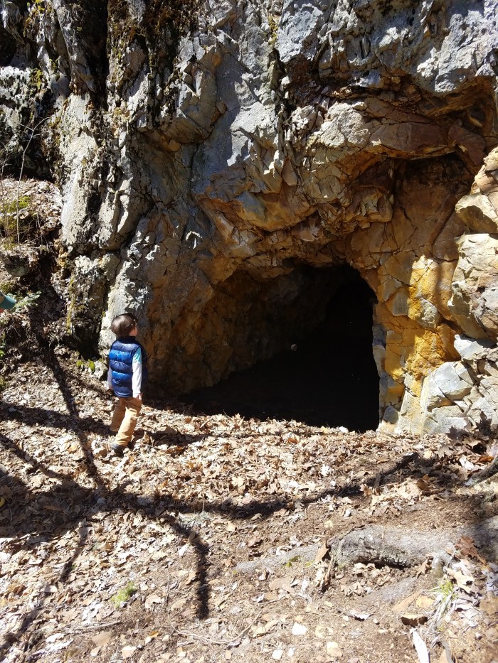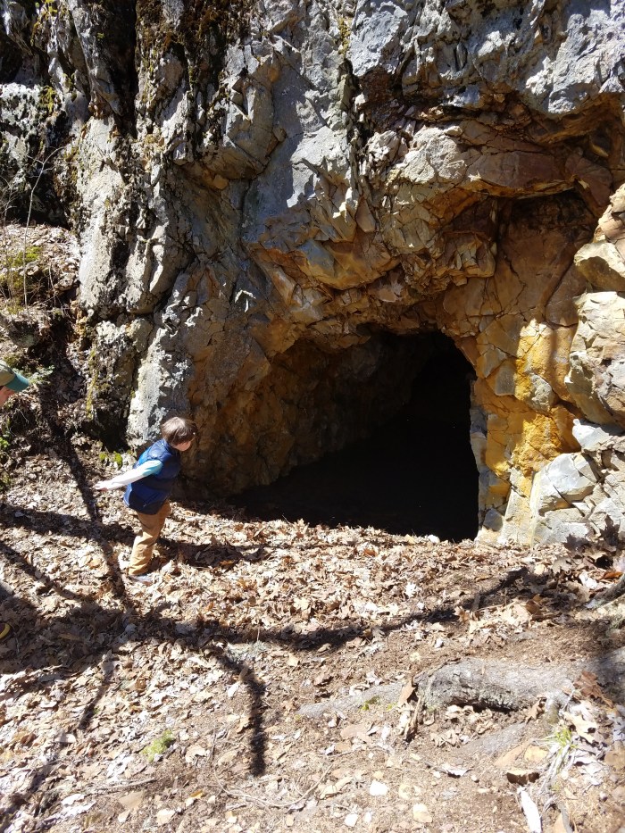 We hiked along and could just make out a rock formation in the woods ahead of us. We crossed a small ravine and found ourselves at the mouth of a water filled gold mine. An empty bird nest hung on the yellow/orange stained wall. Sunlight twinkled in the gray water and danced on the mine wall. We tossed a couple of rocks in the water to see if we could hear how deep the water was. Deep enough for everyone to stay out of it!