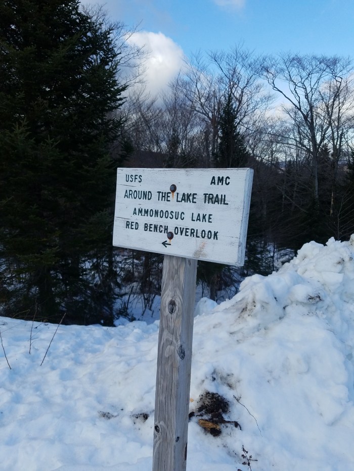 We first checked in with the front desk to ask about walking conditions for the trail around Ammonoosuc Lake. Unfortunately, the young adults manning the desk weren’t very helpful because they didn’t know what the foot traffic was like there and told us that if we had snowshoes we probably should take them. Andrew and Lindsay decided to check it out first and then if needed, run back to the car to get the snowshoes. The Ammonoosuc Lake trail begins behind the Highland Center in a back corner. The trail head was a little difficult to find because snowbanks obscured the view, but eventually we found it and alas, there was lots of foot traffic and no need for snowshoes.