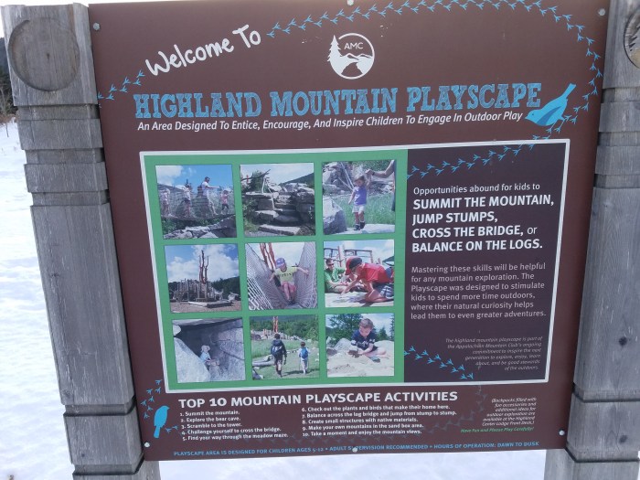At the front of the Highland Center we walked through the snow toward the natural playground. We were surprised at how little use this area gets in the winter. The rope bridge on the natural playground is closed in the winter, but we had fun climbing around the rest of the playground. We kept our eyes to the sky and our ears open, but the cold, windy day kept the birds in the woods.