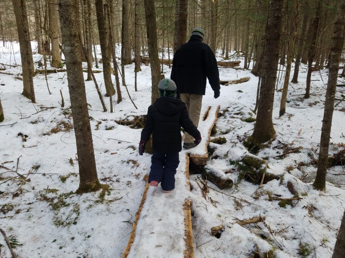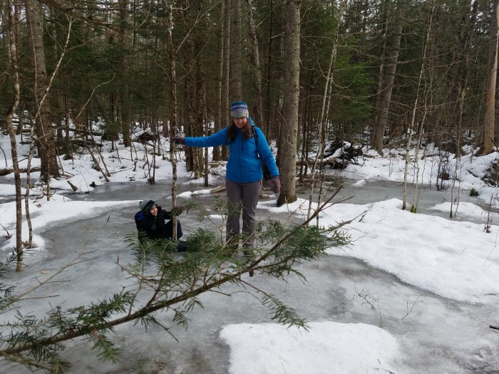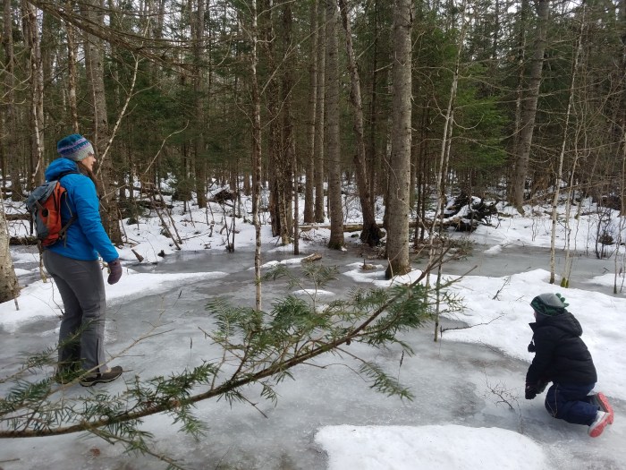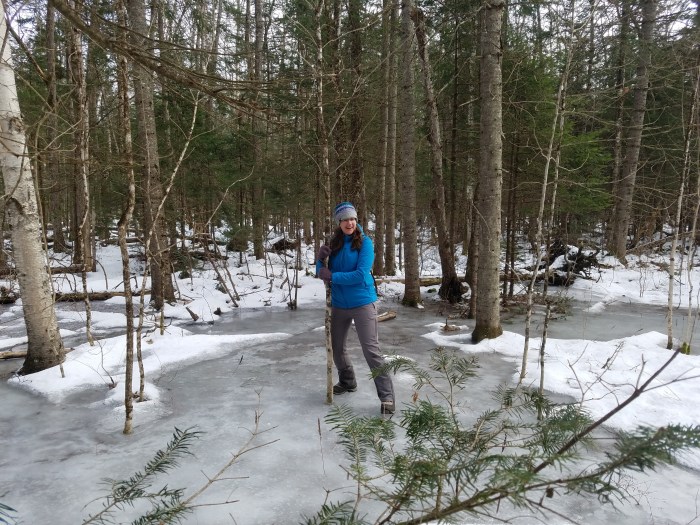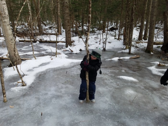 We traversed the softwood swamp and made our way out to a newly discovered stream. The water here had flooded and froze and flooded and froze over the past couple of weeks creating a fun ice skating rink and trails.