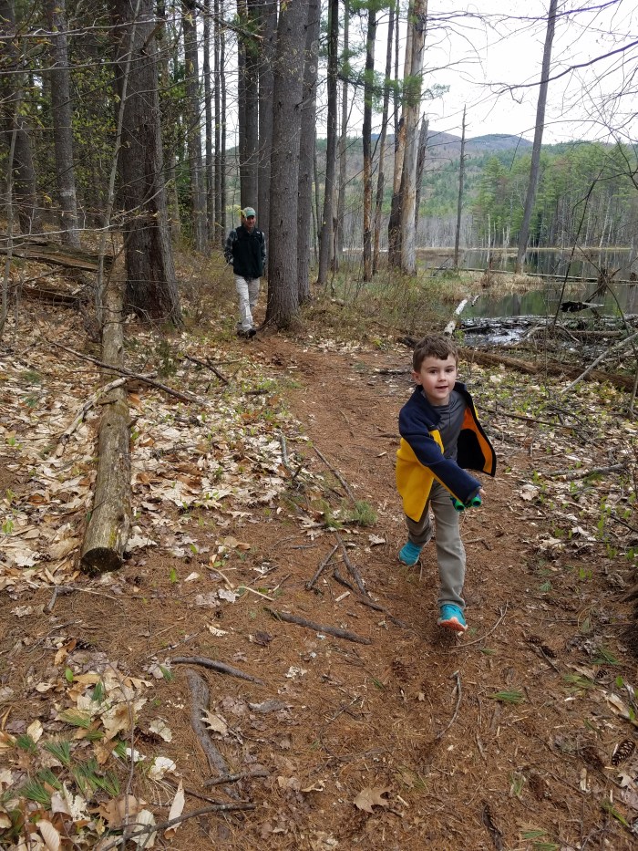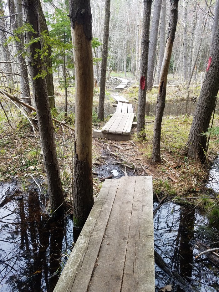 The bog bridges were in better shape a couple of years ago and Andrew quickly surmised that the untreated softwood planks were harvested from a nearby lot and are now starting to breakdown. Several areas were flooded from high spring waters and some of the bog bridges were under water, broken, or in need of repair. Hopefully the managers of the place will think seriously about trail projects this summer because this will only get worse in the coming years. And with this being a great place to bring kids – there is likely to be wet children – like ours, who jumped on a floating bridge only to find it sank immediately bringing him into the water with it! There were some brief tears and wet feet for the rest of the walk, and Alden tested and instructed safe passage over the bridges as we journied on.