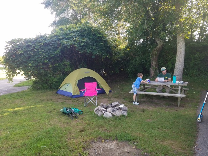 We camped two nights at Fisherman’s Memorial State Campground. We camped in the tent-only area and were pleasantly surprised to find our site one of the few to feel very private. The campground is huge with 4 different sections: mostly filled with large RV’s. However the tent only area was quiet and comfortable. There is a nice big playground, basketball courts, tennis courts, and volley ball net set up -BYOB (bring your own balls). A driveway also brings you to a day use parking lot next to a popular crabbing spot. It’s also just a short 10 minute drive to Galilee where you can pick up the Block Island Ferry, enjoy Roger W. Wheeler State Beach, and enjoy some fresh caught fish dinner at any number of restaurants (we went to George’s of Galilee and loved it!).