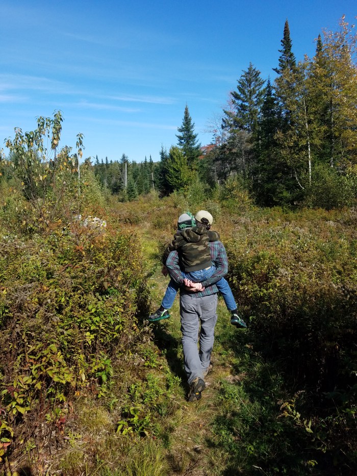 It is a lovely walk and we enjoyed the fall foliage. Alden had a homework assignment to gather a few leaves for pressing and we found several that were perfect. The cool air had us bundled up in the shade, but when we walked through the open forest areas, the hot sun warmed us up quickly. Fall is here in northern New Hampshire!