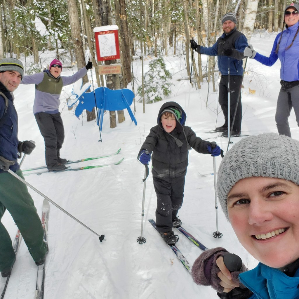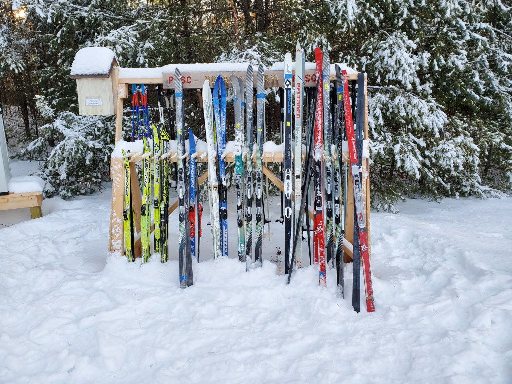 Five out of the six in our group had brought our own skis and we walked the short distance to the entrance. They have skis and boots that you can borrow – lots of different sizes too. I put some money in the box for a donation, grabbed a map, and we headed out onto the trails.