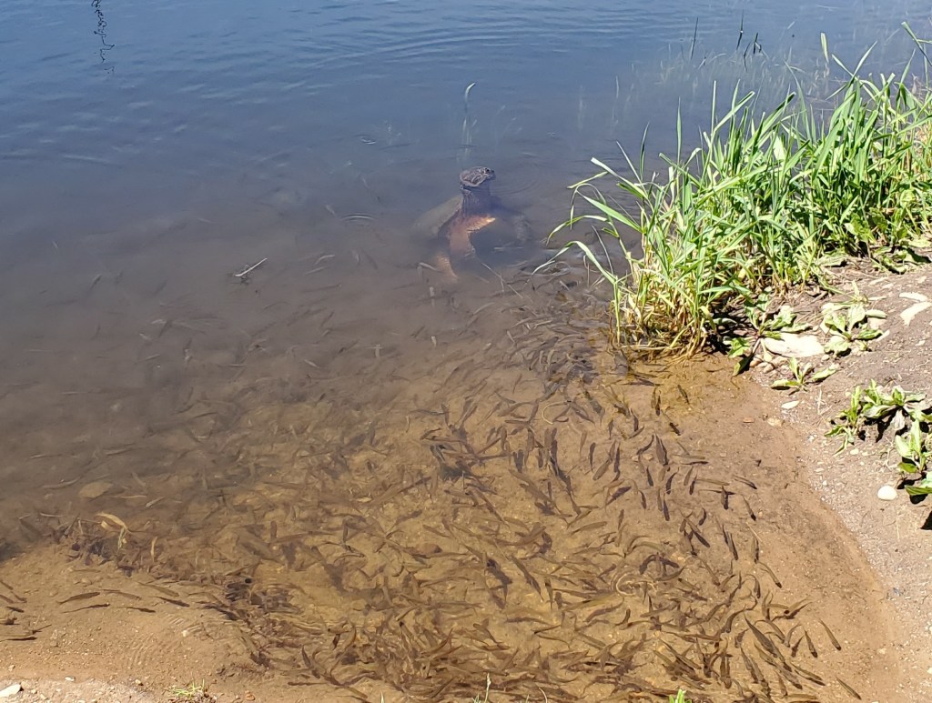 We texted our friends Sarah and Frederic who parked at McDonald’s – just a few minutes ride from us. Then we all headed down the rail trail. We only saw a handful of people heading out and enjoyed watching turtles and fish in a pond next to the trail. Further along the Winnipesaukee River comes into view again with several side trails leading down to it.