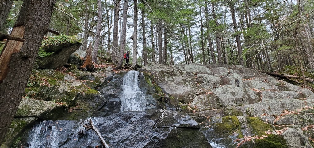 We took the Ruth Walter Trail on the south side of the stream and quickly came to Rainbow Falls. This impressive rock face has many steps, where water cascades down. On this day, in the Fall, the water was flowing, but not nearly as impressive as the water flows in the Spring or after a big rain event.